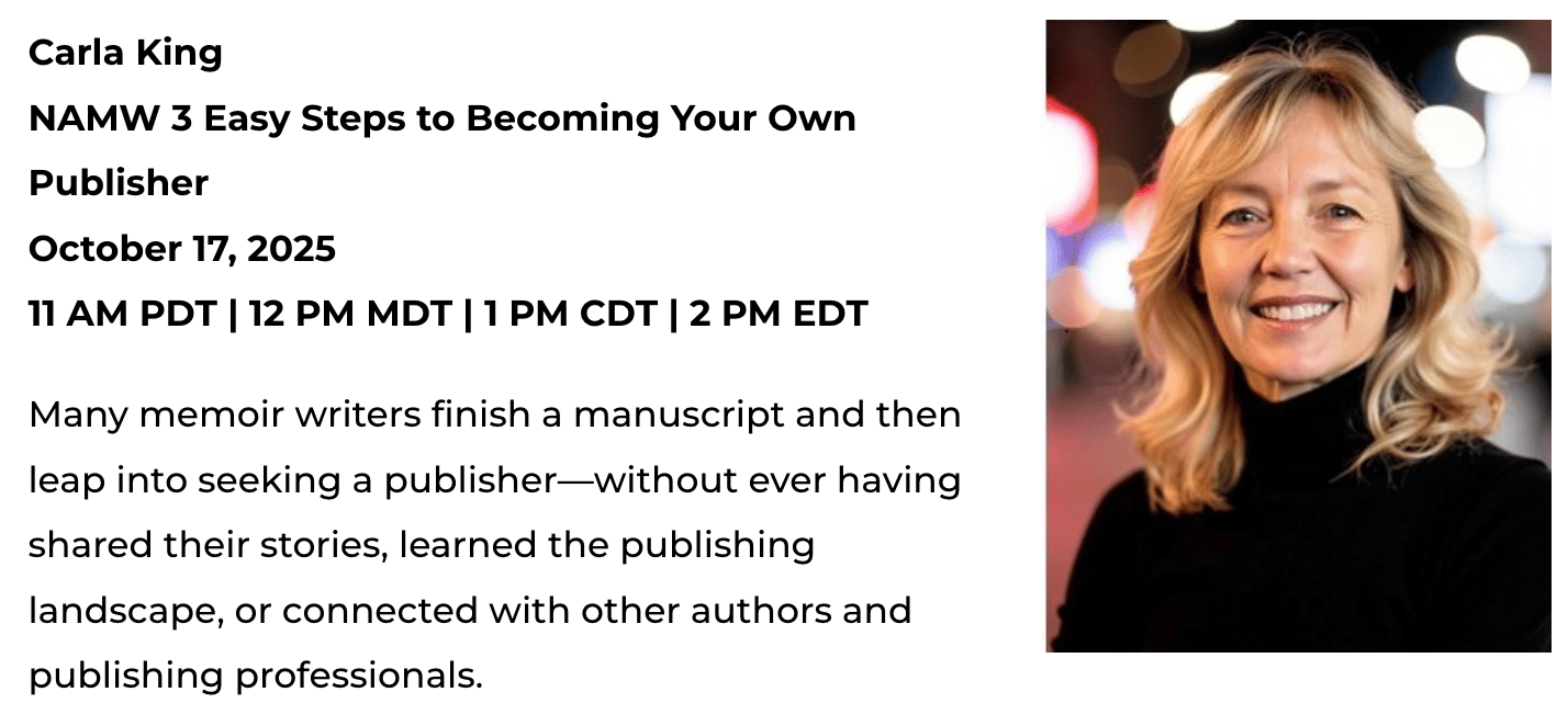 Hi Reader, No matter how you plan to publish—indie or self-publishing, with a hybrid press, or with an agent and a corporate publishing deal—you need to know the basics of publishing, marketing, and promoting your books. So I hope you'll join my workshop tomorrow: Write It! Share It! Publish It! Your 2026 Author RoadmapTomorrow, Friday, 9/20/2025 10:00 am PT/1:00 pm ET $15 members | $40 non-members GET DETAILS AND SIGN UP HERE This is a two-hour learning and brainstorming workshop hosted...